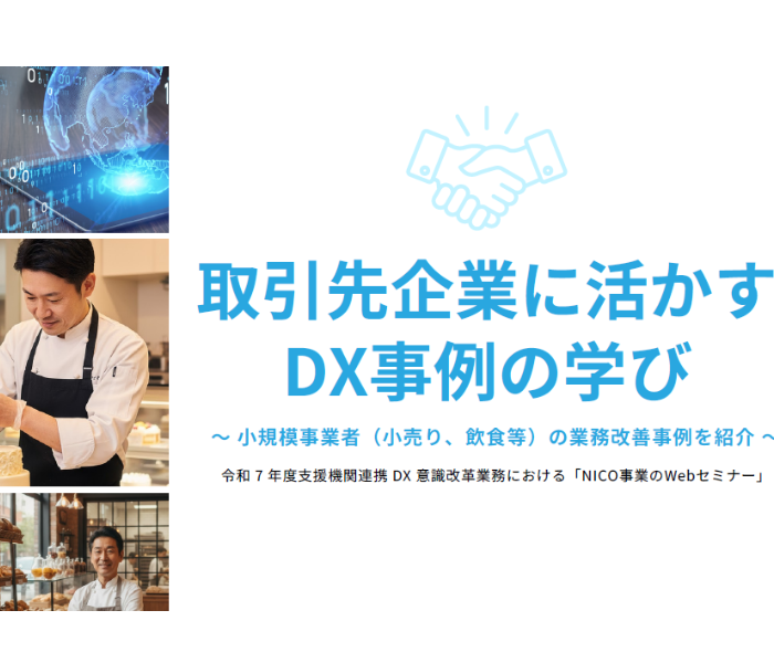 令和 7 年度支援機関連携 DX 意識改革業務における「NICO事業のWebセミナー」について以下の内容でセミナーを行いました。当協会は企業の各種事例を紹介することでDXの一助になるよう活動してまいります。