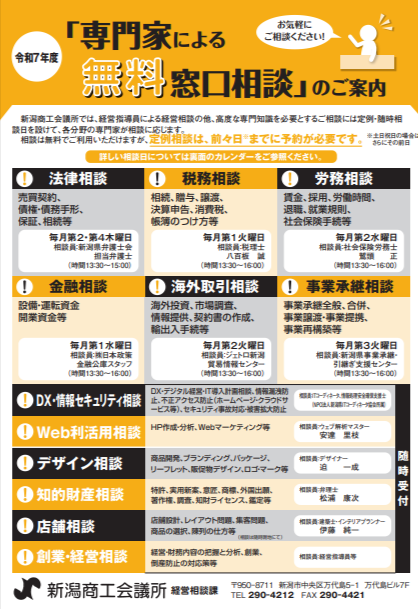 新潟商工会議所「DX・情報セキュリティ相談」にて相談対応を行いました 2025 10/16 活動報告(会員) 2025年10月16日 10月14日、新潟商工会議所にて開催された「DX・情報セキュリティ相談」で、相談対応を行いました。ChatGPTをはじめとするチャットAI利用時のセキュリティ対策、機械の稼働時間管理、Excelの活用方法などについて個別にアドバイスいたしました。 担当:武内副代表理事 新潟商工会議所チラシ 活動報告(会員) 「ITCA表彰2025」地域支援賞優秀賞を受賞しました。